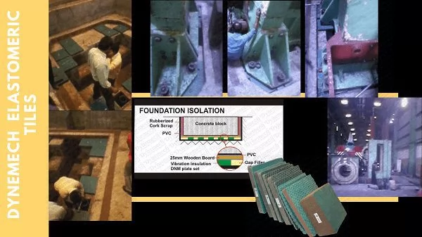 Interposing isolating media: Isolating media such as Dynemech Vibration Insulation tiles , Dynemech Viscous Dampers are introduced between the machine and the foundation to effectively increase the amplitude of the motion and decrease the natural frequency of the systems to reduce the vibration and shock transmission.