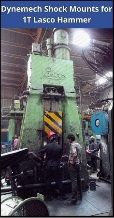 After the impact caused by the collision of ram and the anvil, the forging hammer moves down on the support structure and starts oscillating. The kinetic energy generated is passed on to the supporting structure after the intended forging / metal-forming operation is performed. Dynemech Shock Isolators mitigate the vibration transmission through two mechanisms: