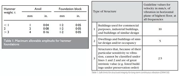 Moreover, the natural frequency of the vibrating forging hammer-foundation system , which is defined by the stiffness of the spring vibration dampers or elastomeric vibration dampers and the supported mass should be designed in such a way that it differs significantly from the resonant frequency of the solid concrete foundation.